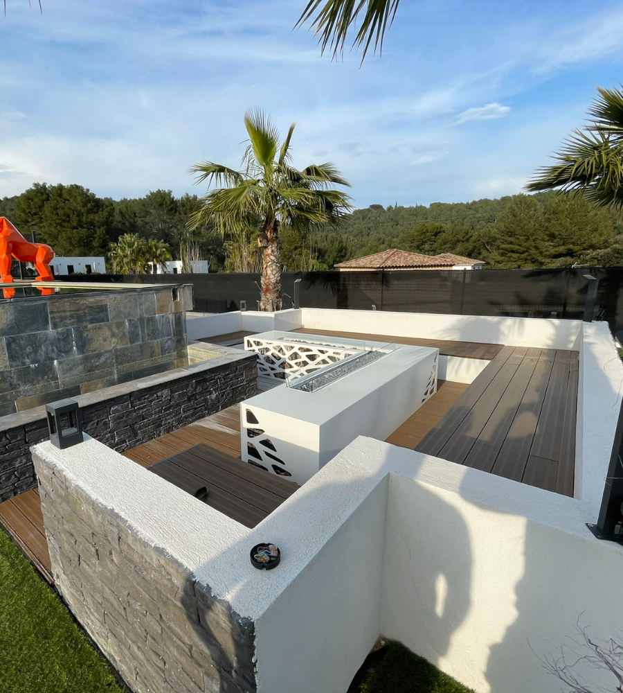 Nous avons récemment réalisé un projet d’aménagement extérieur à Bandol, dans le Var, en créant un revêtement de sol et des assises à la fois esthétiques, durables et faciles d’entretien.